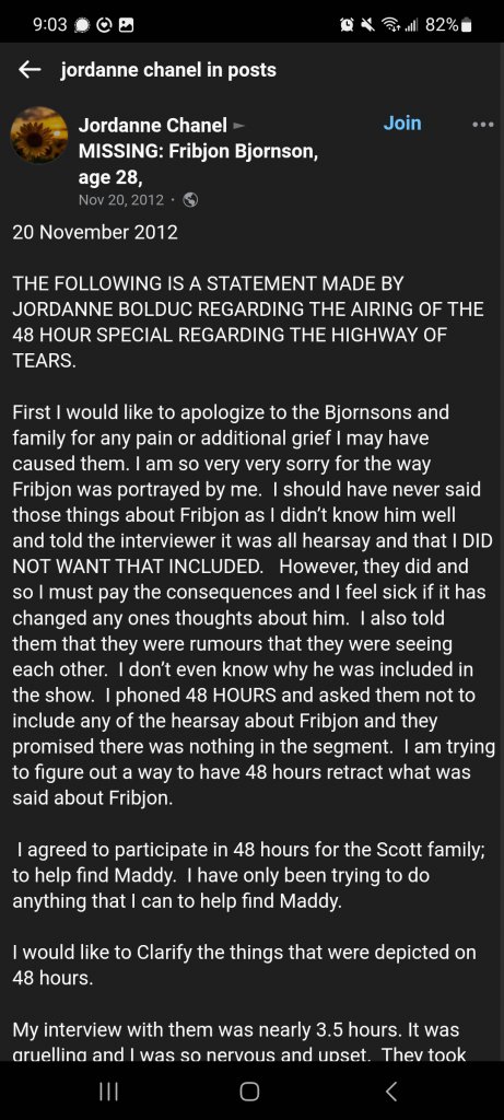 There are things that have been said in town about HOW and WHO found her and it would be perfectly acceptable, that that way did occur. I will say again, with 100% confidence, that this has nothing to do with the Highway of Tears. I could say lot's of things but it would get me kicked out of here, so this is unfortunately where i will have to remain silent. Maddy wasn't an addict. She wasn't drunk. She was physically strong. She had a mind of her own. She was very close to her family. All the "assumptions" here are going down the wrong road.