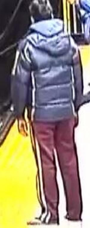 He was wearing a blue winter jacket with yellow piping, maroon pants with grey-and-black stripe, and flip-flop sandals.