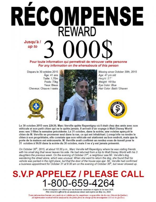 Marc Verville was last seen with his small dog around 10:30 p.m. the night of Oct. 30, 2015 in Repentigny, where he was visiting friends. He had returned from a trip to Walt Disney World with his three daughters the week before.