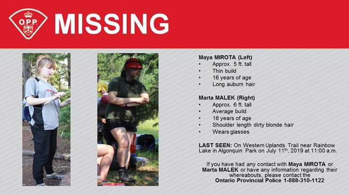 Found Safe Canada - Maya Mirota & Marta Malek, both 16, Algonquin Park, 11 July 2019