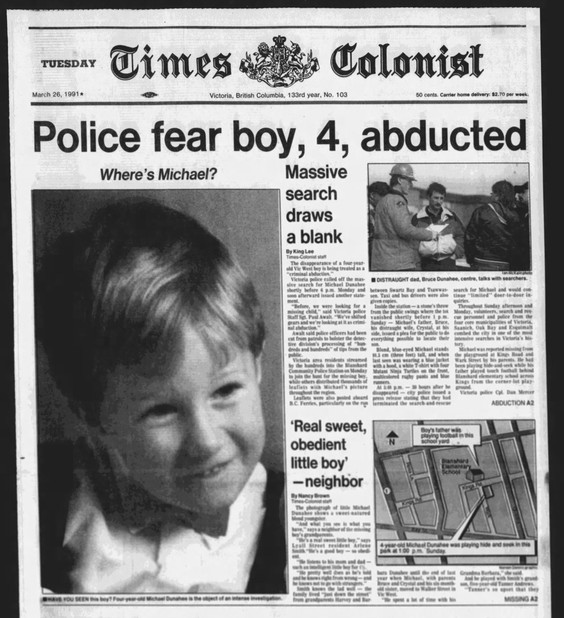 The Dunahees and the Victoria Police did everything right: Authorities were summoned immediately, a description of Michael was disbursed to the media, and a tip line and command post were established within hours. One of the first tips was an alleged sighting from a child, who reported a man in his late 40s in a brown van at the park. “We did put a lot of resources into the brown van tip. In fact we did locate a brown van — a number of brown vans — and we eliminated the owners and drivers through interviews,” now-retired VicPD Detective Inspector Fred Mills
