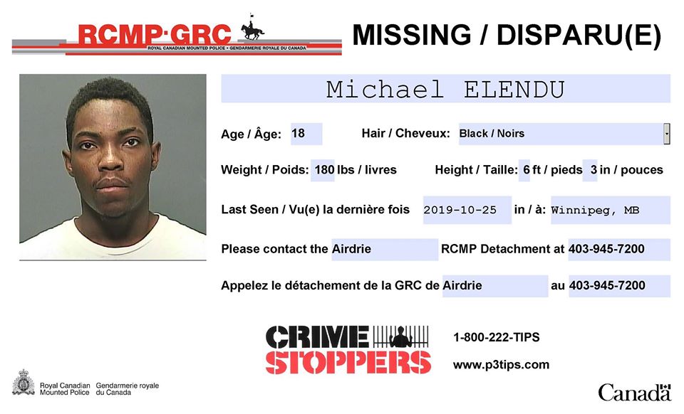 Anyone with information on Elendu's whereabouts is asked to contact Airdrie RCMP at 403-945-7200 or local police."