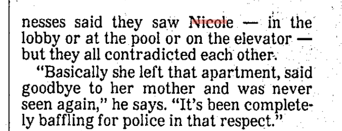 At 10:30am Nicole had gone to the lobby of the twenty story apartment building to pick up the mail. She returned to the apartment and got ready to go swimming with a playmate. Before leaving the apartment Nicole had spoken to a friend through the building's intercom and promised to be right down. The playmate waited about 15 minutes before buzzing the apartment again to find out why Nicole hadn't arrived. The two girls had arranged to meet in the lobby and go to a supervised swimming pool at the rear of the building.