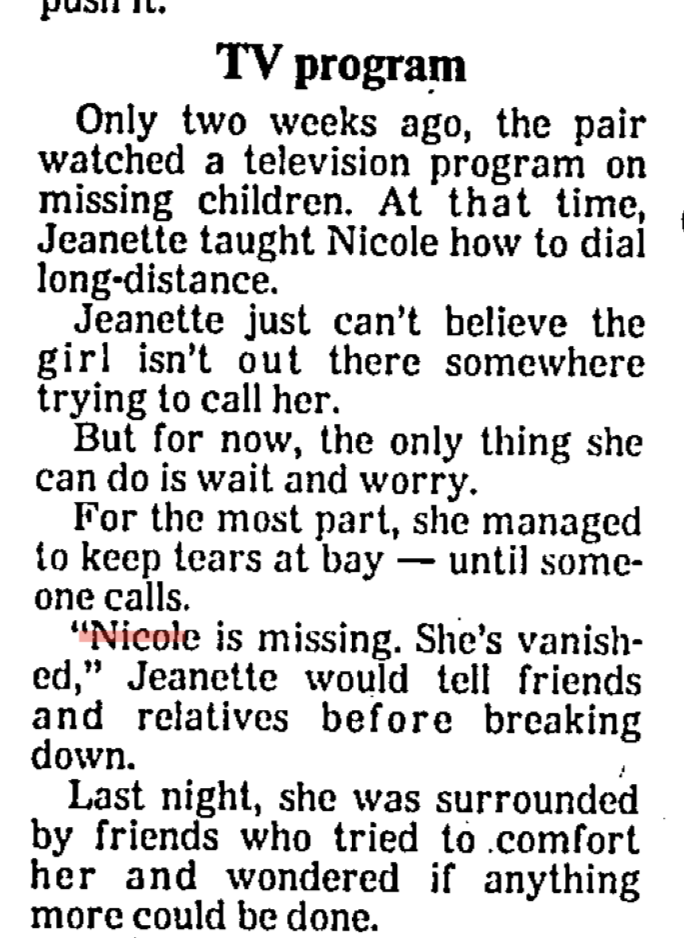 Per another Toronto Star article... Jeanette and Nicole had watched a show about missing children on television. I'm now curious to know which show that might have been. Could that be why Nicole had written in her diary that she was going to go missing? The article states that Jeanette had taught Nicole how to dial long distance as a result of watching that program. It really makes me wonder what the heck was going on. Friends came and went trying to comfort Jeanette. I'd love to know which friends and family. Who came, when did they come and what was their demeanour? I acknowledge there is no manual for how people ought to behave when someone is missing but I'd still be suspicious and I would like to know. This article also indicates that police went down to Jeanette's car with her in the parking garage to search the car and trunk with her. Did police have reason to think Jeanette might be hiding the little girl? Oddly an article adjacent to the one I'm discussing shows a quote from Jeanette saying: "I know someone's killed her".