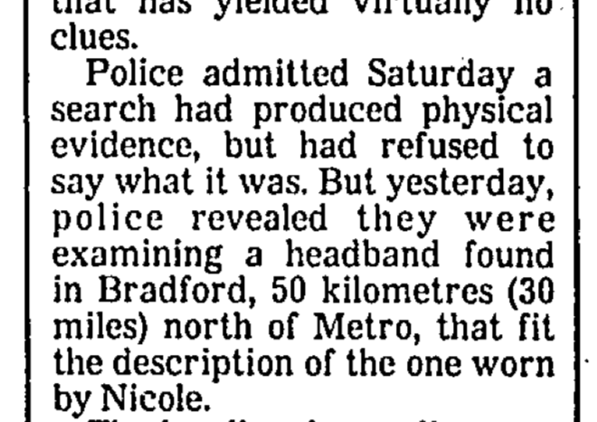 At one point in the search, police stated in the media they were sure they'd find Nicole within days - they even halted the search to focus on the investigative side. They refused to say what evidence had been found, or where it had been found. Another article indicated a headband had been found by a couple near Bradford which matched the description of what Nicole had been reported wearing when she vanished. It was later deemed unrelated to Nicole's case. But I wonder... how did they rule it out? I hope they did a DNA test on that thing!! What did they think they had that they thought might lead to them finding her and why didn't that lead pan out?