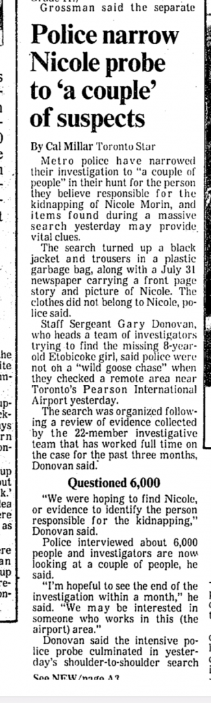 Ok Sleuthers - if you were an investigator, and you were going to hit this case right now, where would you begin? I'd actually like to get access to police records on this matter - they interviewed 6000 people according to one article I read (Toronto Star, but I didn't note the date / page). .