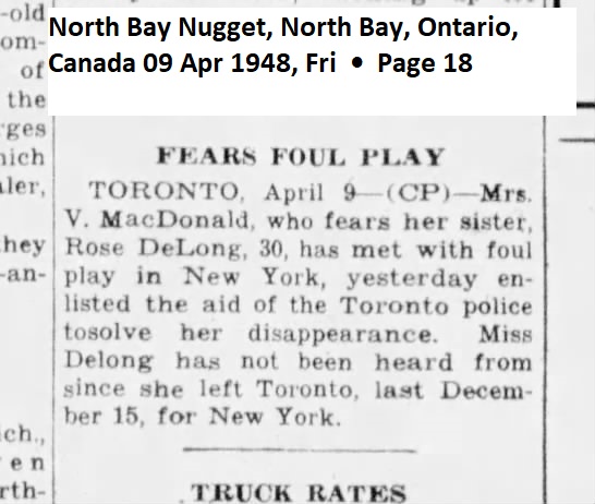 DeLong was last seen leaving her family home in Toronto, Ontario on December 15, 1947. She intended on traveling to the USA to take a course and to buy equipment to start a weight loss clinic. She has never been heard from again. Few details are available regarding her disappearance and her whereabouts remain unknown.