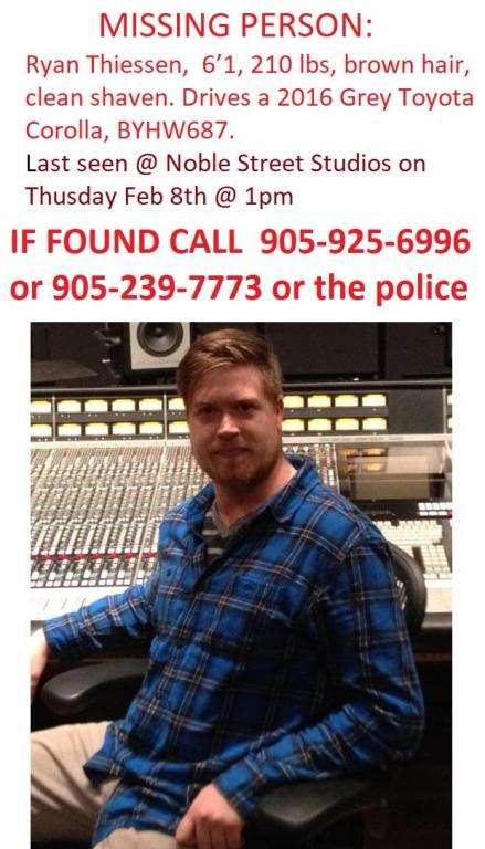Durham police say Ryan Thiessen was last seen leaving work in Toronto in his dark grey 2016 Toyota Corolla. The vehicle has the license plate BYHW687.