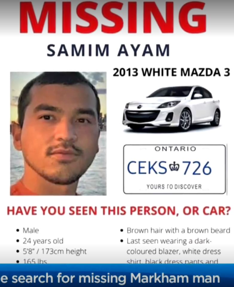 Twenty-four-year-old Samim Ayam had been missing since Nov. 4 and both family and police say it’s very uncharacteristic of him to disappear for this length of time and not communicate with loved ones.Samim Ayam has been missing since Nov. 4, when he was last seen at 4 p.m. at his place of work at the Markville Mall. He reportedly told his employer he wanted to go home during his shift.