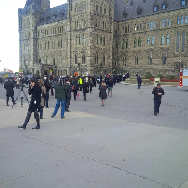 Photo: People being let back into Parliament building in Ottawa after a false fire alarm went off, 1 day after shootings - @MaBlaisMorin