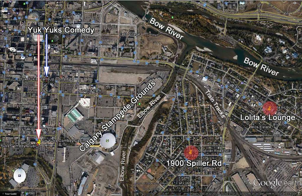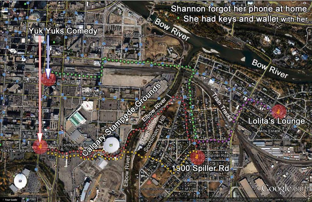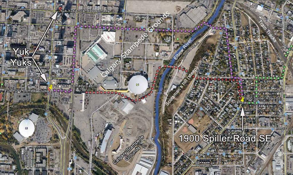 The bigger picture between where Shannon was last seen, in the 1900 block of Spiller Road SE Calgary, Lolita's Lounge, and Yuk Yuk's Comedy Casino (per theories upthread). This illustration is in no way related to any evidence. It is a map of her last location and two proposed locations where she may have intended to go after she was last seen.