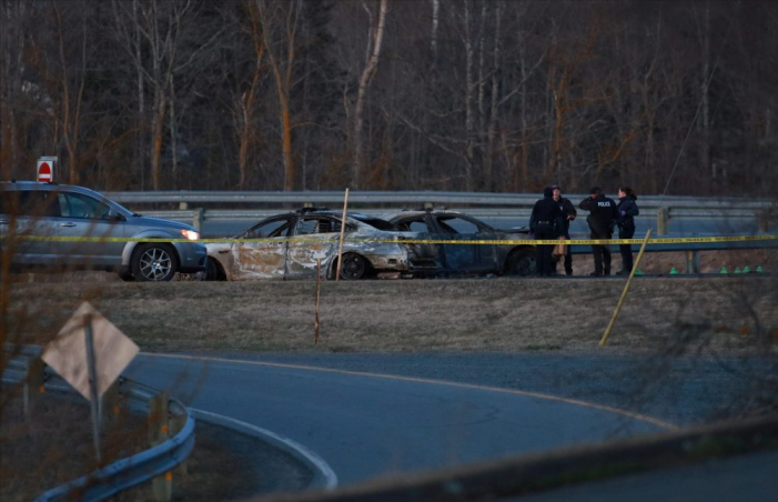 RCMP officers go over a car collision scene involving the fake RCMP car driven by Gabriel Wortman in Shubenacadie, Nova Scotia, Canada April 19, 2020. REUTERS/JOHN MORRIS
