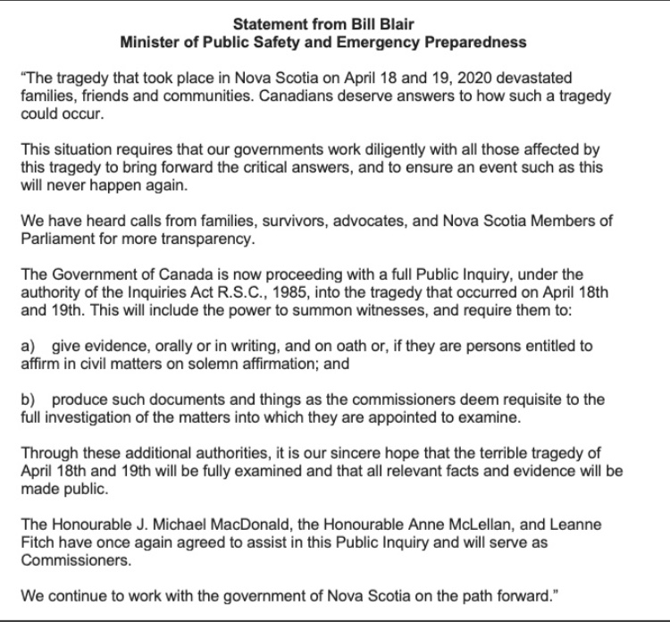 Clearly, there were mistakes, serious mistakes - mistakes that very likely resulted in people losing their lives. It seems highly unlikely that the panel review will not uncover at least some of those mistakes and failings, and that a panel will make related findings and recommendations. Equally likely, those findings will point to short-comings in the RCMP - training, equipment, staffing, decision-making, reporting, experience, supervision, etc., whatever. That, and gun violence, in general, and questions about whether it is possible to identify and flag individuals with this killers potential in advance and what can be done, if anything, to prevent such a psychotic break, would seem to be more appropriate subject matter for full blown inquiries.