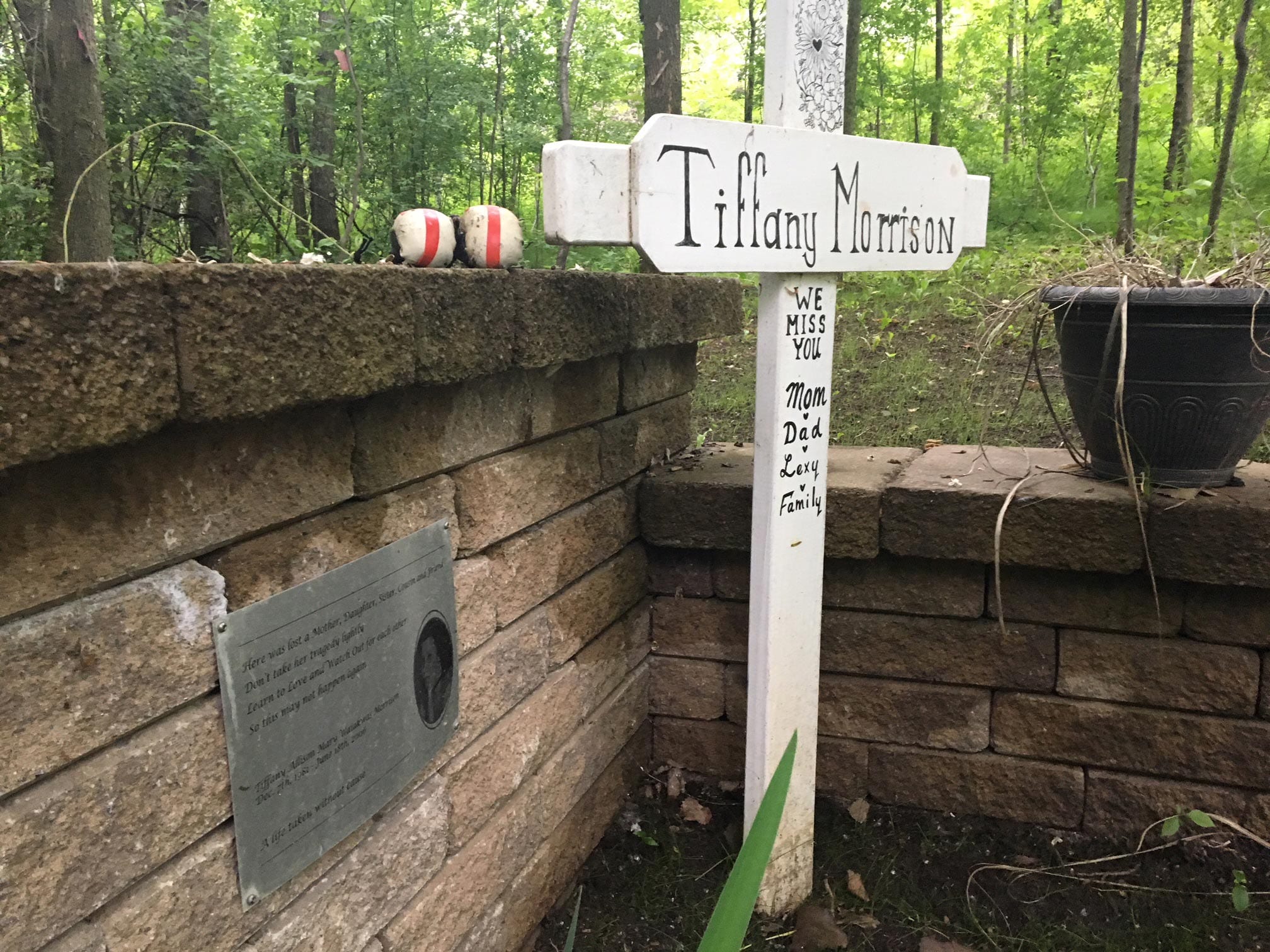 A memorial to Tiffany lies in the shade of several trees, close to where she was found.