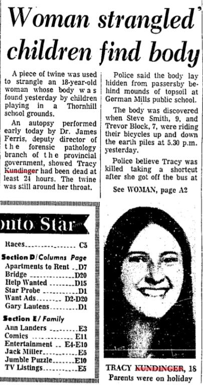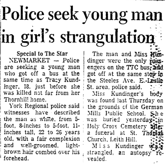 .Sunday, August 12th, 1962: The defiled body of 16-year-old Julian (Julie) Wolanski is found in a ditch off Indian Line (at the time relatively remote farm country north of Toronto Airport near what is now the Claireville Reservoir), sparking one of the largest unsuccessful manhunts in the city’s history. The victim, a shy girl who lived on Wallace Ave. in the city’s west end and went to Givins St. public school, had been missing since Tuesday the 7th. She had been stripped of almost all her clothes, brutally raped, beaten about the face and head, shot through the heart with a .32 calibre bullet, and dumped out of a moving car into the ditch where she lay. She must have been held captive for several days, because an autopsy and other evidence determined she had been dead not much longer than 48 hours before she was found. A man living near the isolated body-dump scene recalled hearing a car’s brakes screeching several times on Friday night.