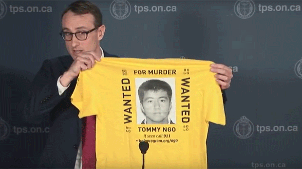 Tommy Ngo is wanted for second-degree murder and, as part of the campaign to apprehend him, Langlois says people will be walking around Toronto wearing bright yellow T-shirts with his face on them and handing out flyers.