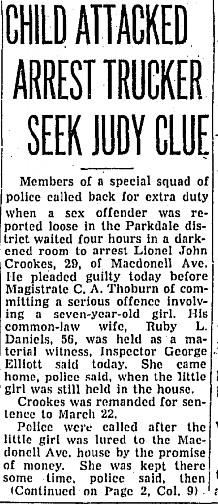 ●On Friday, February 25th, 1955, 8-year-old Judy Carter spent a couple of hours after school playing with two boys from her class. They cavorted for a while in the schoolyard of Winchester Public School before the boys invited Carter over to their house on Rose Ave. to look at comic books. At 6 p.m. Judy left for home, and the last time her playmates saw Judy Carter alive, she was heading east on Winchester St. towards Parliament St., in the direction of her home on Metcalfe St., just two blocks away. She never arrived home.