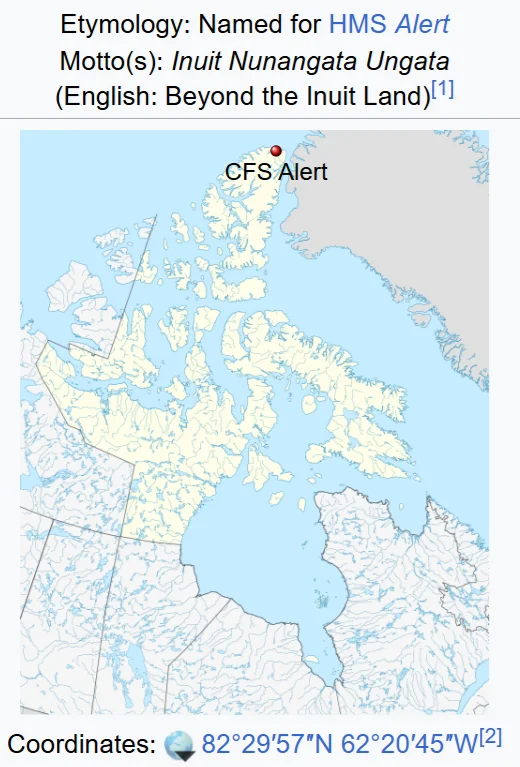 CFS Alert is named for the HMS Alert which wintered 10km south of the station in winter 1875/76 - so the passages were even open way back then during the season. CFS Alert is located on the very northern tip of Ellesmere Island and is the most northerly permanently inhabited place in the world (by Canadian Military personnel and civilian contractors doing environmental studies and listening to the Ruskies). Arctic Expeditions launch from the Station there as it is the closest to the North Pole at 850ish km away.