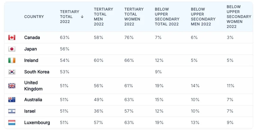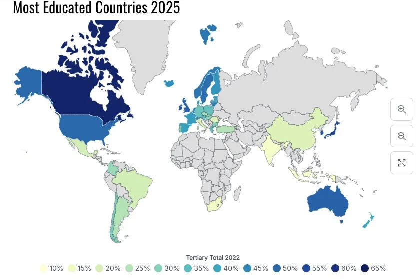 "Canada has the most highly educated workforce in the world. Nearly 58% of Canadians have a post-secondary education. Canadian universities, colleges and vocational institutions are recognized worldwide for producing a highly skilled, globally competitive workforce that fuels the country's growth."