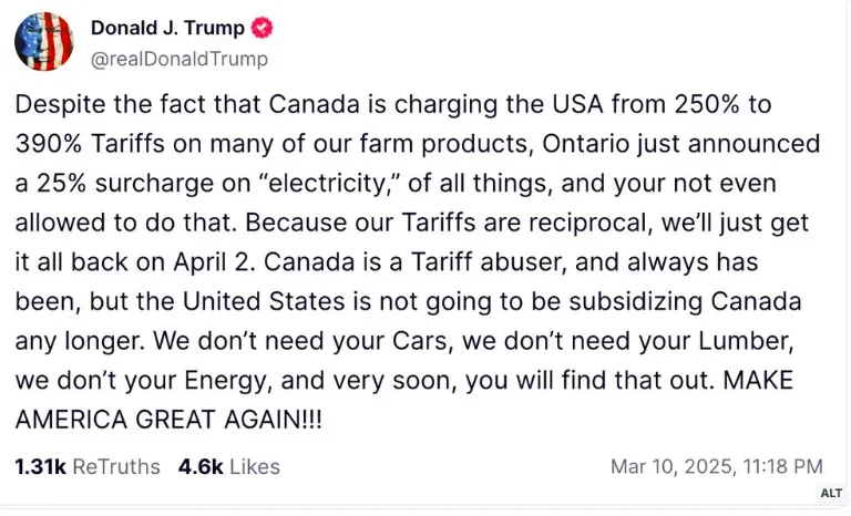 A surcharge on electricity (retaliation to tariffs) is an abusive threat? Hasn't the USA government been announcing for weeks that the country does not need anything from Canada? Why is a price change on electricity a problem?
