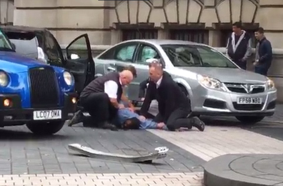 Dramatic pictures taken at the scene show guards holding down a man covered in blood with rubble strewn across the road.