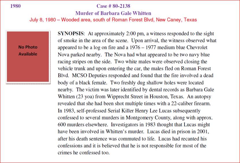 On January 16, 1981, the unidentified girl was buried in the Adickes Addition at Oakwood Cemetery. Huntsville Funeral Home buried her, and Morris Memorials provided her tombstone. It is believed that Henry Lee Lucas killed this girl, but investigators could not make a match between the bite mark on her left shoulder and his dental reconstruction. STILL UNSOLVED.