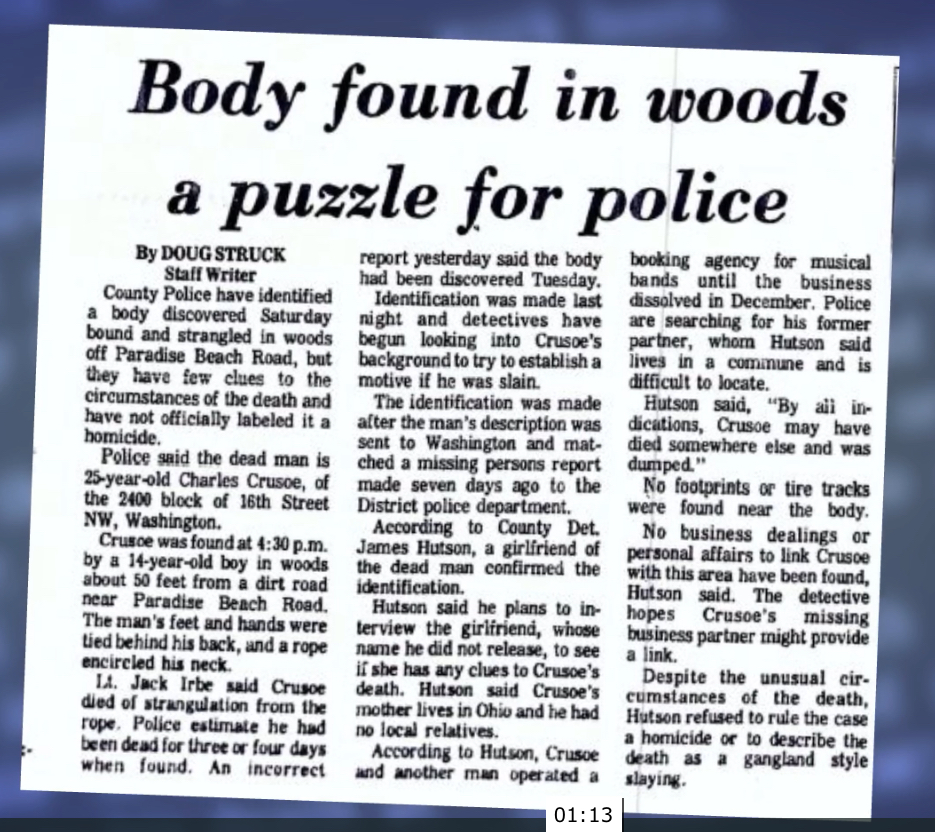 Police say Crusoe, 25, was found murdered around 4:30 p.m. in Pasadena on February 2, 1974.