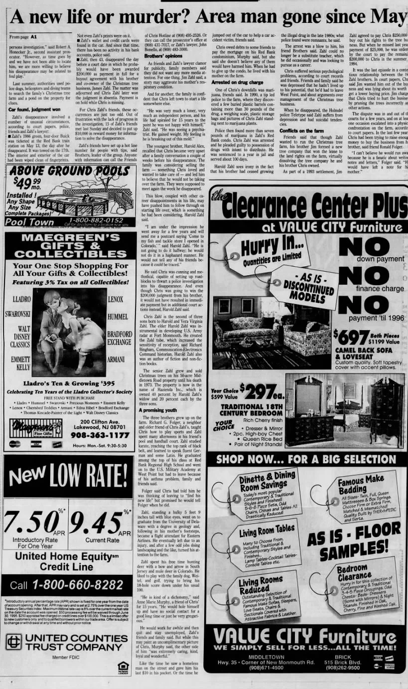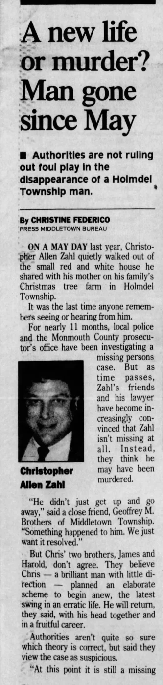 Christopher Zahl was last seen in Holmdel, New Jersey on May 12, 1994. His vehicle was found the next day at a train station in Red Bank, New Jersey. Foul play is possible.Investigating Agency(s)
