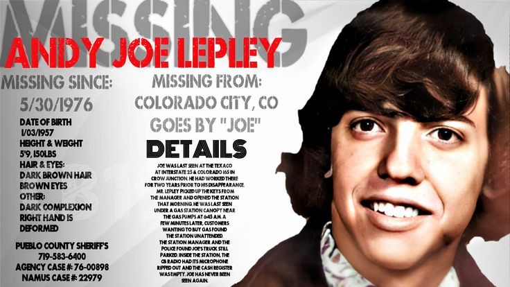 Foul play is suspected in Lepley's case. He was a senior and honor student at Rye High School at the time of his disappearance, studying motorcycle mechanics in a vocational porgam, and went missing just days before graduation. He was a pole-vaulter, a football player and basketball player, and once had been president of his class. After his graduation, Lepley planned to spend the summer working for his father as a plumbing apprentice, then enlist in the Air Force and attend Adams State College.