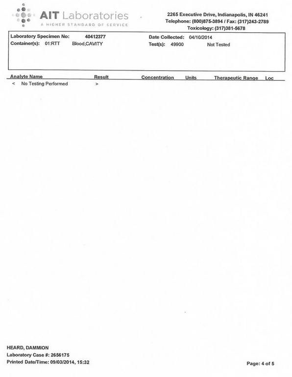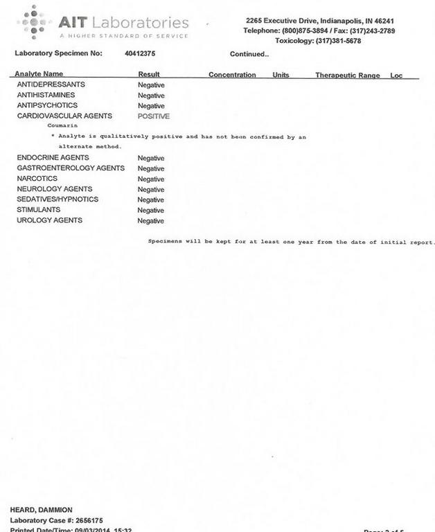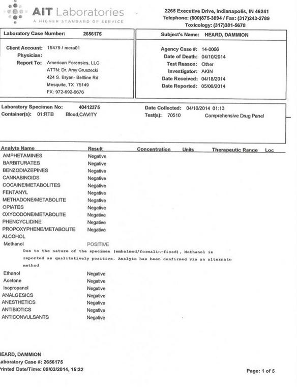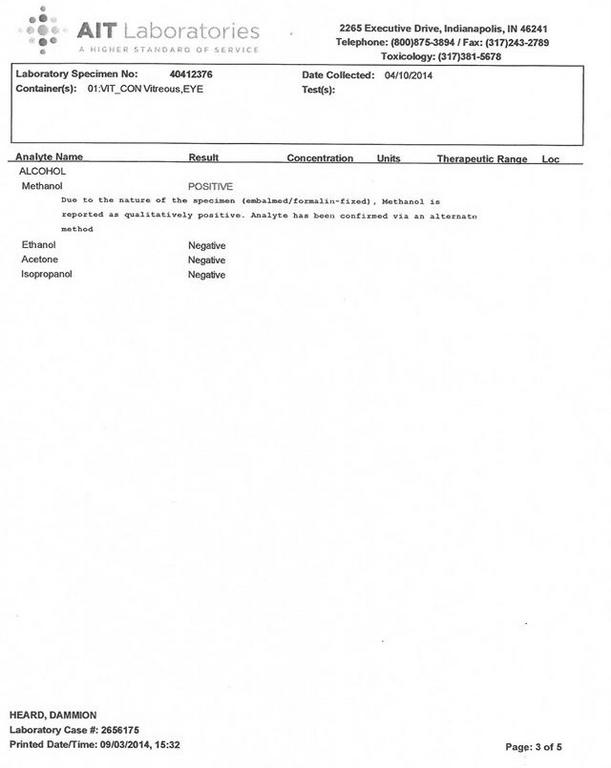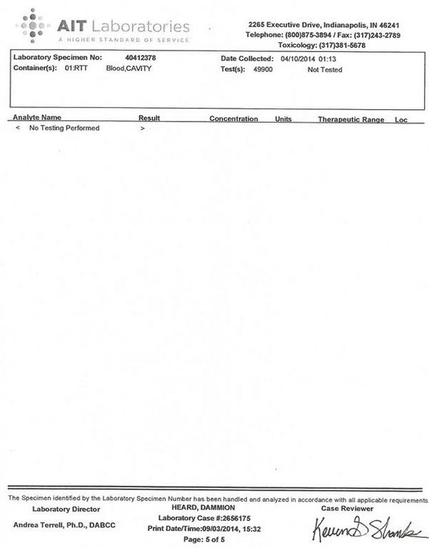 Requests were made to Coroner Frank Vader and Pathologist, Dr. Benziger for Dammion’s toxicology report. I specifically asked for the report on the reference laboratory letterhead. They released the results to the media, and I got a copy with the autopsy report, however, it is NOT on the reference laboratory letterhead. We have been requesting this for over one month.