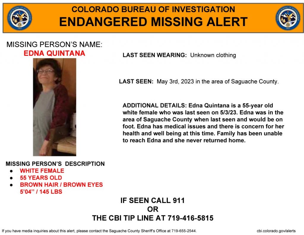 According to Saguache County Search and Rescue, Edna Quintana may be missing in the mountains surrounding the San Luis Valley town of Saguache.