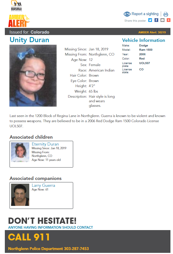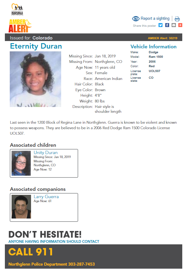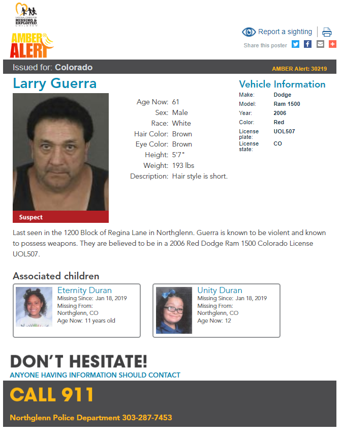 They were last seen with Larry Guerra, 61, who is known to be violent and possess weapons, according to Northglenn police. The girls and suspect are believed to be in a 2006 Red Dodge Ram 1500 pickup with Colorado license plate UOL507.