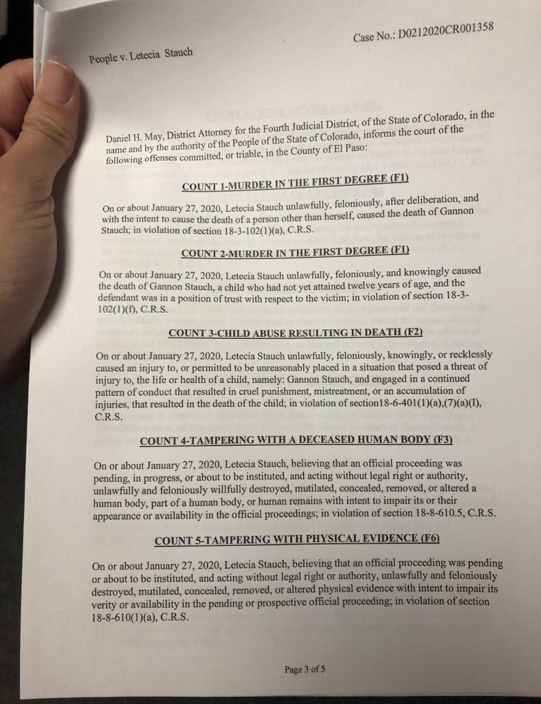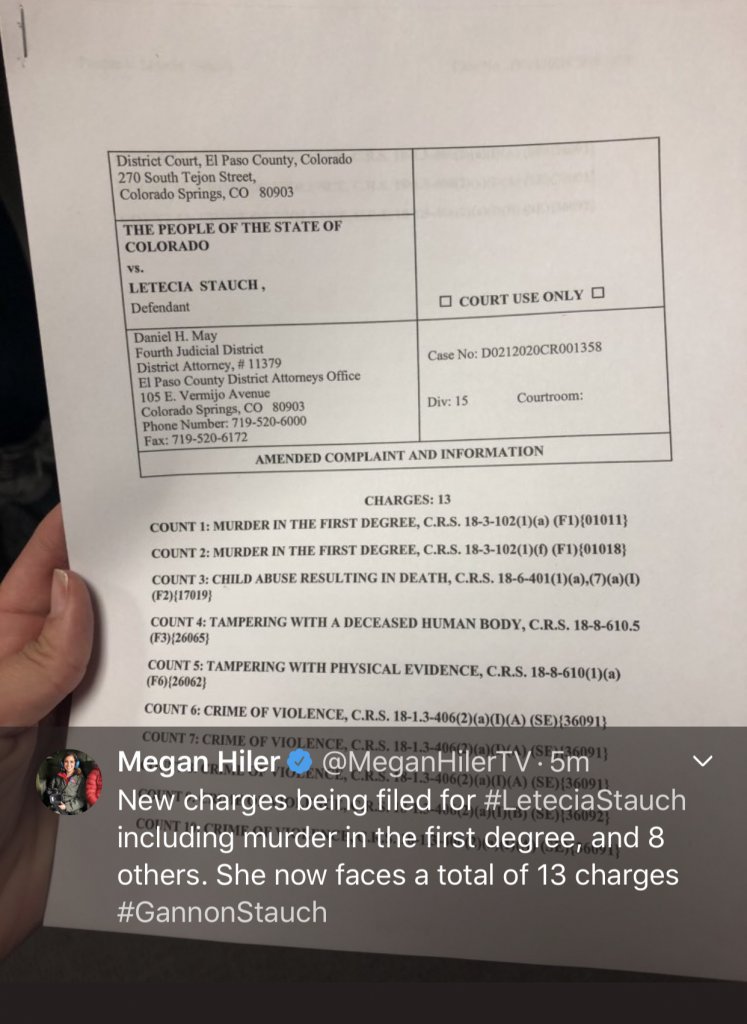 “New charges being filed for #LeteciaStauch including murder in the first degree, and 8 others. She now faces a total of 13 charges #GannonStauch