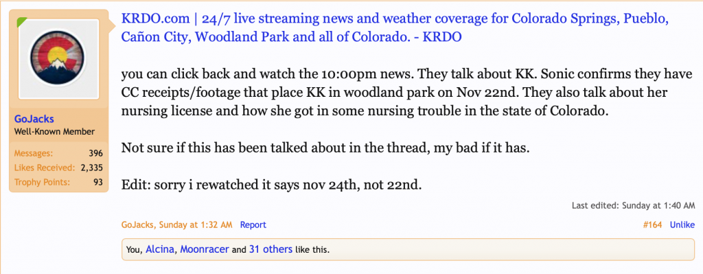 IMO, If LE had gone to KK and asked her what is up, she may have denied it, or maybe her BFF would not even have provided KK's name for LE to do a follow up. There really is not clear answer here, and hindsight is 20/20.So what would you say to LE if you were BFF's employer? "My employee said her BFF said her BF in CO said he wanted his baby mama dead and asked his GF to do it." No crime has been committed. What would they investigate? Should PF have been arrested in October when KB was alive and well and going about her business? Should IN have been arrested then for telling her BFF what her BF said? Should BFF's employers have been arrested because they heard an unsubstantiated rumor? MOO>