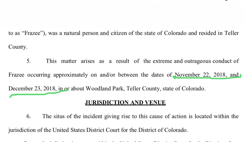 "5. This matter arises as a result of the extreme and outrageous conduct of Frazee occurring approximately on and/or between the dates of November 22, 2018, and December 23, 2018, in or about Woodland Park, Teller County, state of Colorado. "