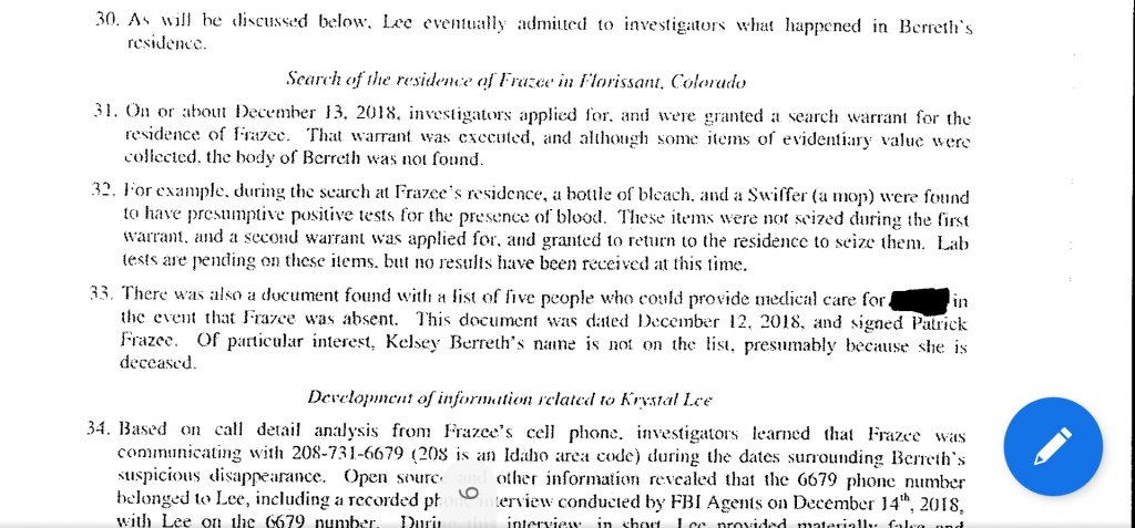 65. On or about November 22, 2018, Lee stated that Frazee called her and instructed her to come to Colorado and told her she "had a mess to clean up." Lee stated she couldn't come until the 24th of November, and when she did come, she brought bleach, gloves, a hairnet, shoe covers, and other supplies from Idaho. Your Affiant submits that when Frazee discussed a "mess," Lee understood that as Berreth had been killed. Cell phone call and text records support the fact that Lee and Frazee did indeed have conversation on the 22nd of November, 2018 as Lee reported.
