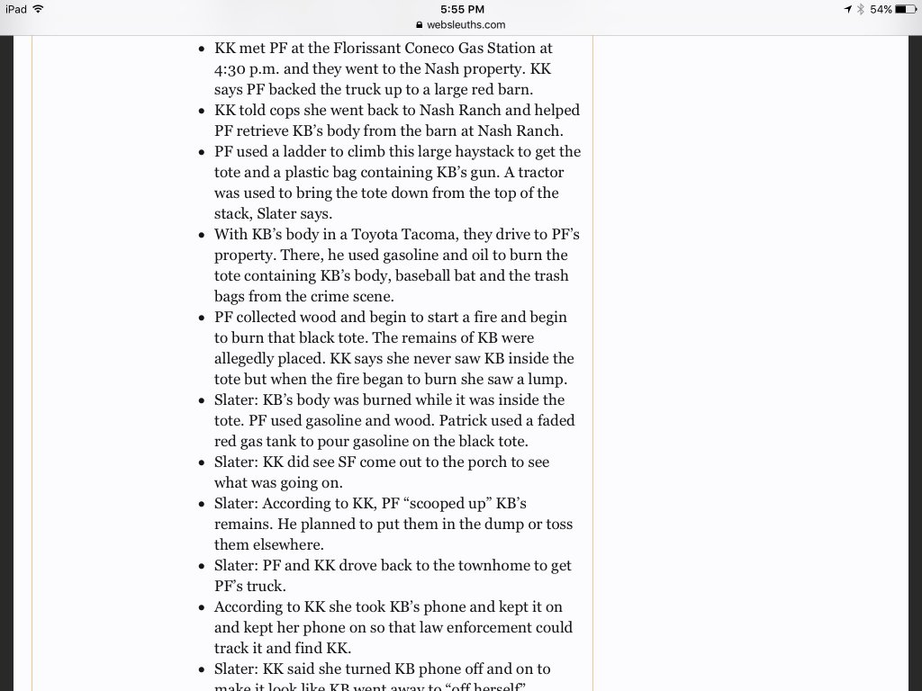 • KK told cops she went back to Nash Ranch and helped PF retrieve KB’s body from the barn at Nash Ranch.