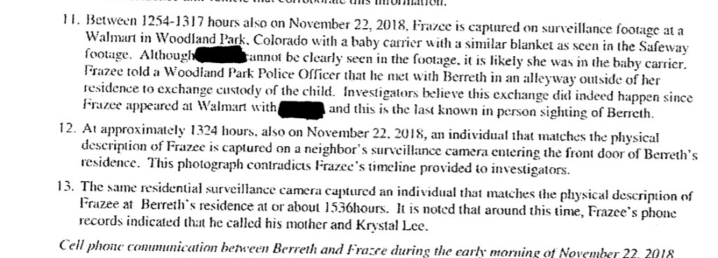 The search warrants reveal that on the day Berreth disappeared, she left a Safeway grocery store in a red Chevrolet Silverado. A red Toyota Tacoma matching Frazee’s vehicle is seen on surveillance video turning north onto Fairview Street in Woodland Park. A minute later, Kelsey Berreth’s vehicle is seen turning north onto the same street.