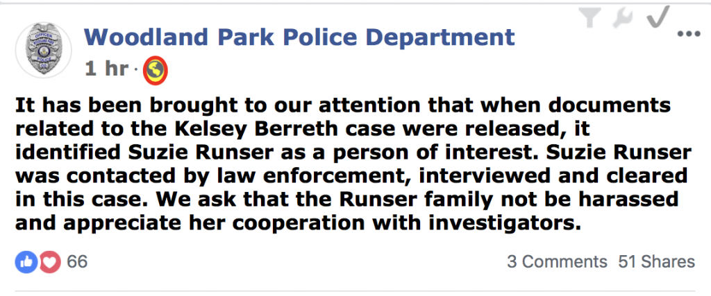 From the Woodland Park Police Department: S R was contacted by law enforcement, interviewed and cleared in this case. We ask that the R family not be harassed and appreciate her cooperation with investigators.