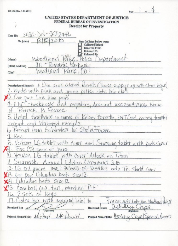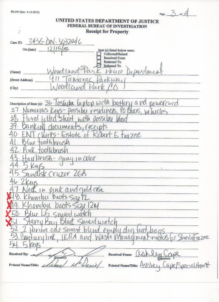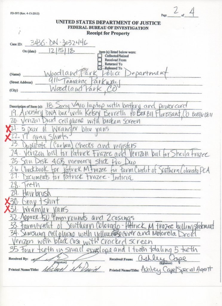 “On 12/04/18 the Colorado Bureau of Investigation (CBI) and the Federal Bureau of Investigation (FBI) was requested to assist the WPPD due to the suspicious circumstances surrounding Kelsey’s disappearance. CBI Agents Gregg Slater and Kevin Torres responded to assist. CBI Agent Gregg Slater requested a second search of Kelsey’s residence, curtilage, and vehicles. Agent Slater also arranged for a human decomposition K9 to respond to Kelsey’s residence and vehicles for the presence of human decomposition.