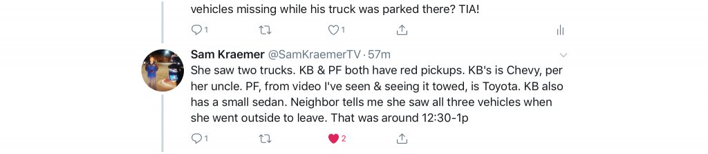 She saw two trucks. KB & PF both have red pickups. KB's is Chevy, per her uncle. PF, from video I've seen & seeing it towed, is Toyota. KB also has a small sedan. Neighbor tells me she saw all three vehicles when she went outside to leave. That was around 12:30-1p