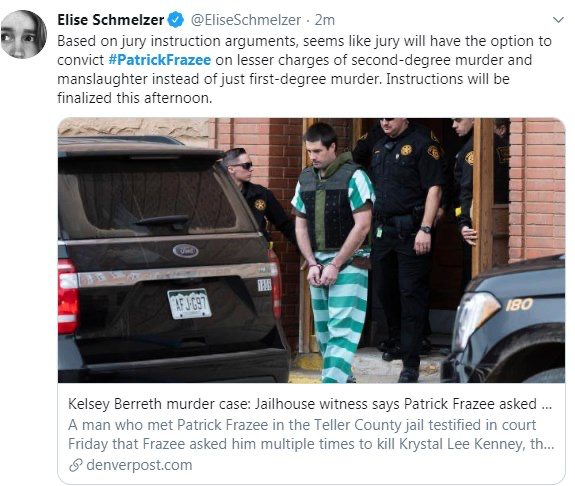 Based on jury instruction arguments, seems like jury will have the option to convict #PatrickFrazee on lesser charges of second-degree murder and manslaughter instead of just first-degree murder. Instructions will be finalized this afternoon.