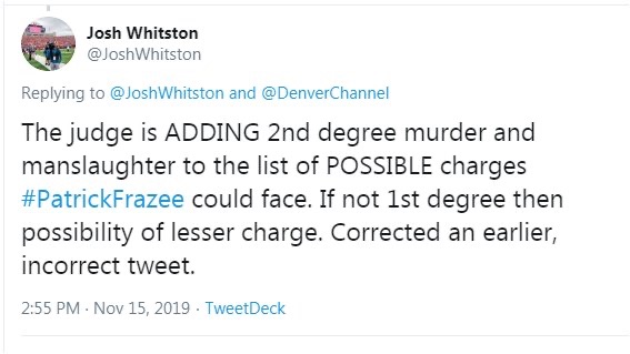 UPDATE: Judge rules #PatrickFrazee won’t face first-degree murder charges, if convicted (which he was charged with). Instead, he’ll face second-degree murder or manslaughter. @DenverChannel #kelseyberreth