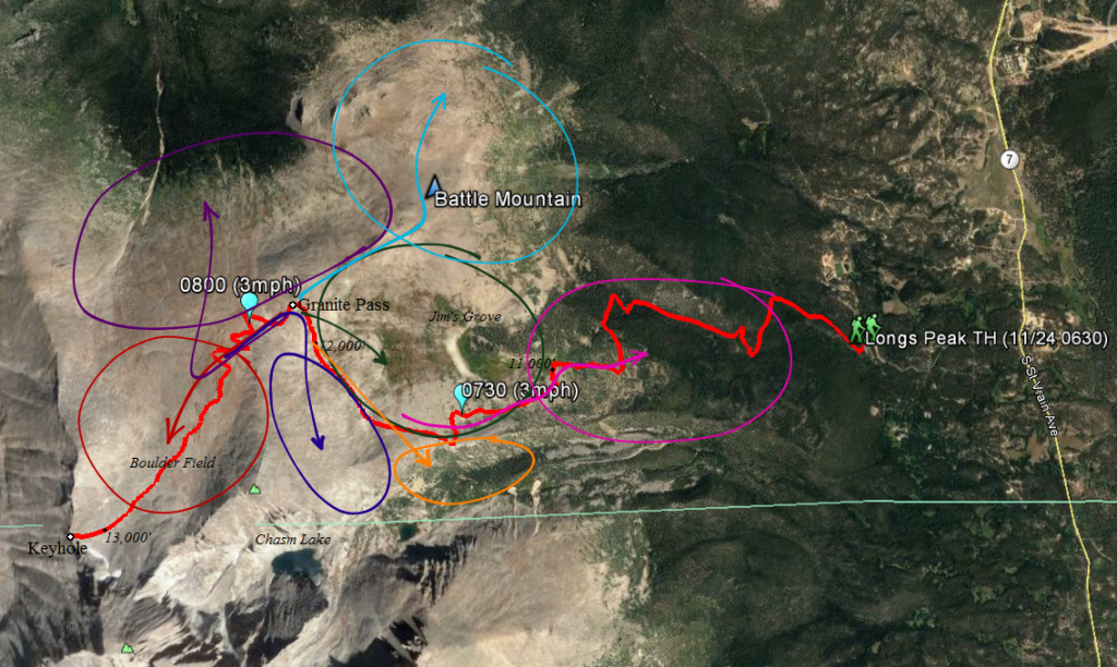 "Searches continued on the ground in the Longs Peak area Thursday, focusing in and around the Longs Peak Trail, East Longs Peak Trail, Granite Pass, and Jim’s Grove area. Crews also searched in the Boulder Brook Trail and the Storm Pass areas.