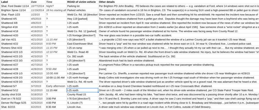 I wonder if the shooter sits in the back to shoot out? It would interesting to know what trajectories he may have taken the shots from. He seems to favor either moving targets or to be moving, like a game. Going through a good bit of ammo too, which may mean he may have more for shooting ranges or somewhere he practices. I bet he's ended up shooting the inside of his car at some point. Sounds like a gamer if it is the same person in all the inicidents, or even half of them, it would have the same trend.