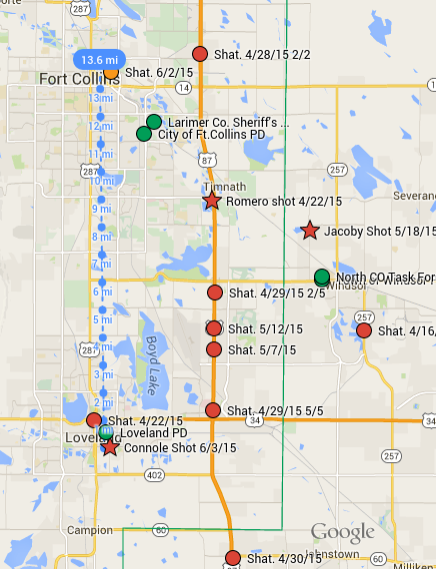 The Connole shooting (star) to the 6/2/15 shattering (orange circle) = 13.5 miles as the mouse flies, and not much further by car.