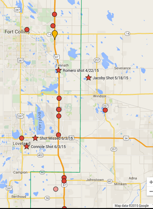 On June 25, 2015, at approximately 8:30 am, the task force evidence recovery team responded to the area of 18th Street and Chelsea Drive in Loveland to follow up on leads from tips they have received. As discussed earlier this week at the media briefing, late last week a person reported to the task force they were shot at in the area of Denver Avenue and East Eisenhower Boulevard. Task force investigators conducted canvasses and interviews of potential witnesses in that area. Today, the task force is continuing their investigation in the area.
