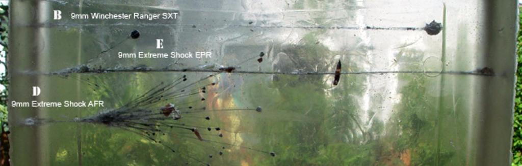 ---- (D), the fourth line down, is for the "9mm Extreme Shot AFR". It's core fragmented into a range of size particles. The same round is reported to move thru hard barriers like sheet metal or glass without disintegrating, and is only supposed to disintegrate if hits soft material or a solid wall of something hard.