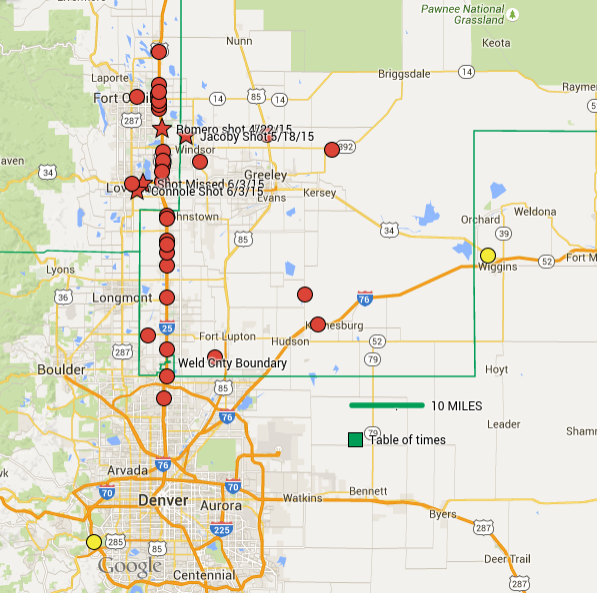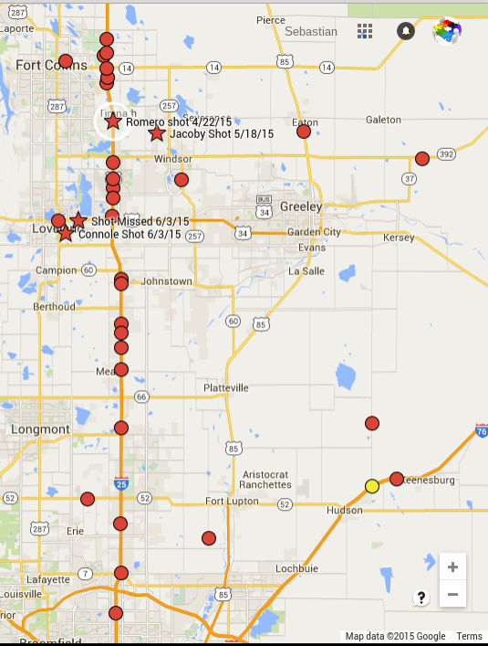 Catching up on the mapping. Here are what I take to be the NOCO MO incidients, with the addition of the shooting of Gary Criswell's semi on Monday 8/31/15, as a yellow circle in the lower right.