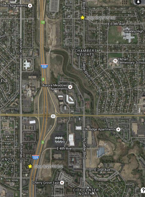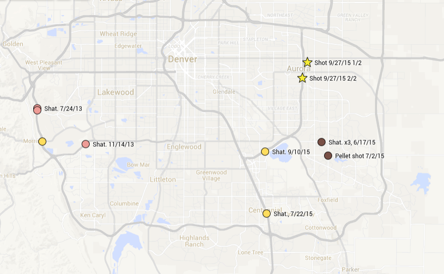 I can't tell whether that means the shootings have stopped, or aren't being reported, or are being reported and we aren't recognizing them. That 9/10/15 incident was south of Denver, where there had been a long series of suspicious and window shatterings in 2013 and at least eight in June thru August of 2015. They haven't gotten much coverage, and we don't have much detail on them.